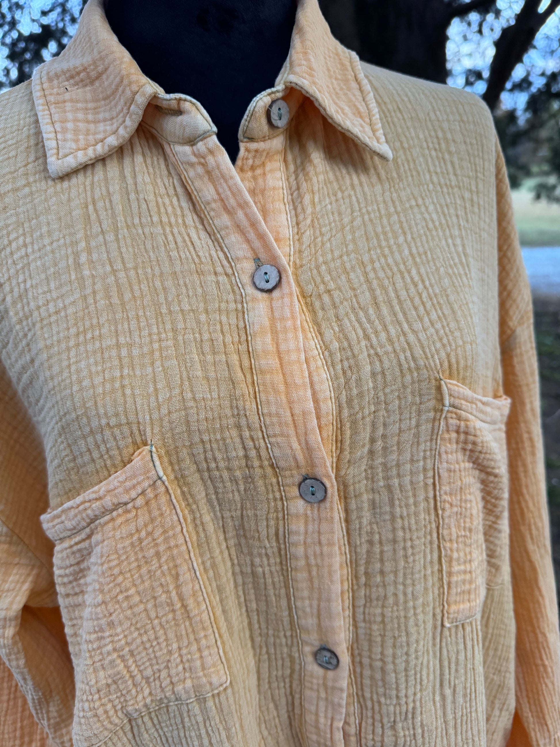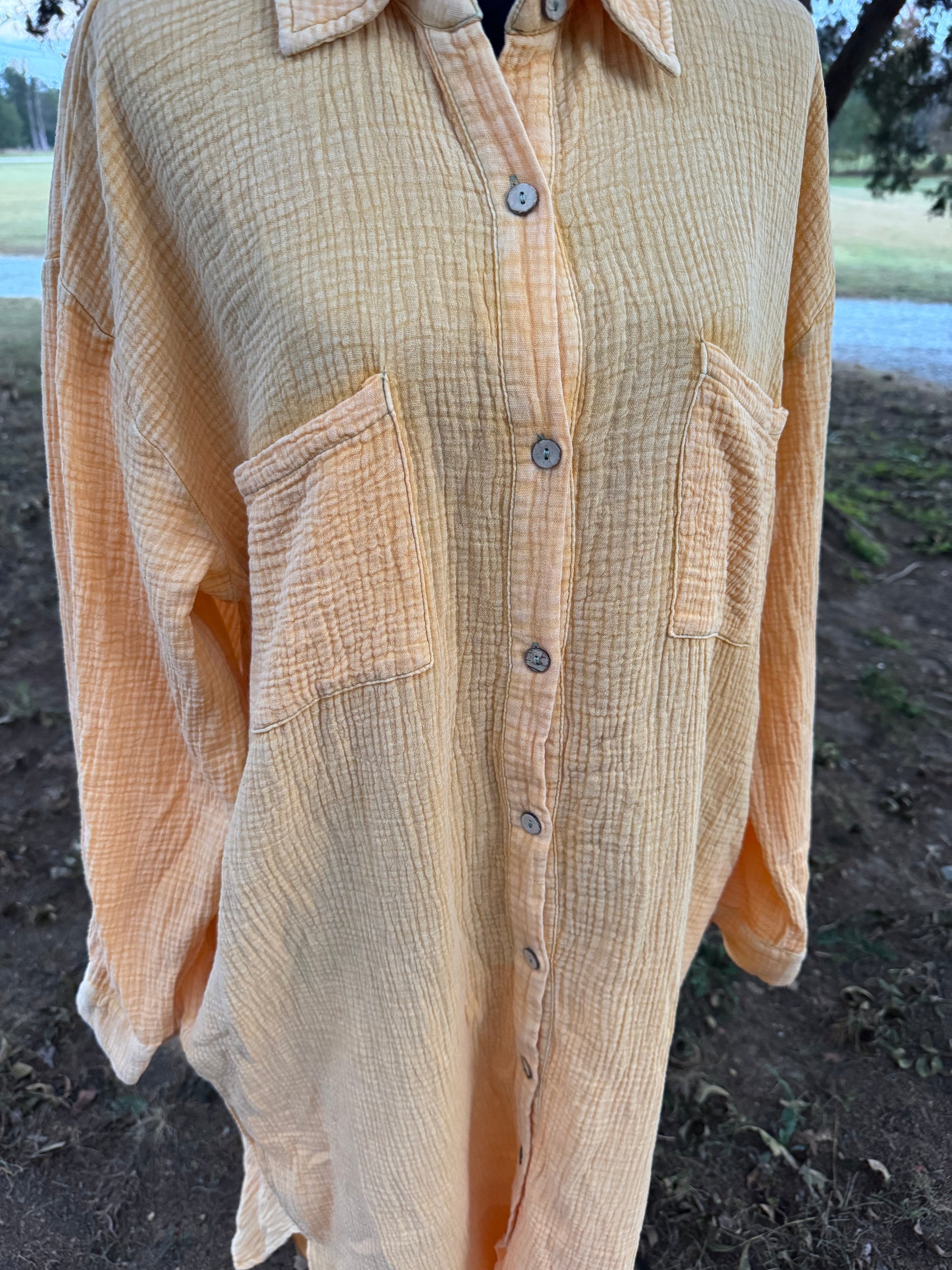 This gauze material dress is perfect for everyday wear! It has pockets and fits oversized so definitely size down.